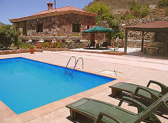 Casa rural de dos dormitorios con piscina climatizada de agua salada y expléndidas vistas a todo el valle. En ella se puede disfrutar de la tranquilidad y preciosas vistas bajo la sombra de un pequeño colgadizo canario o desde la piscina.