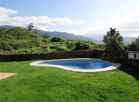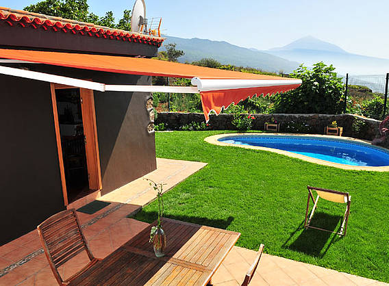 * En sus zonas exteriores los huéspedes pueden disfrutar del amplio jardín con piscina privada, barbacoa y magníficas vistas al mar y el Teide.