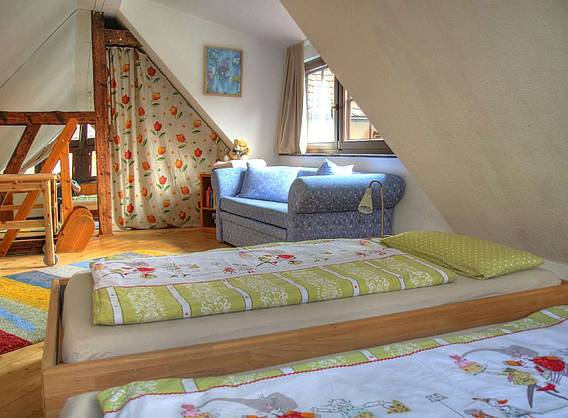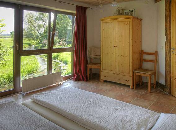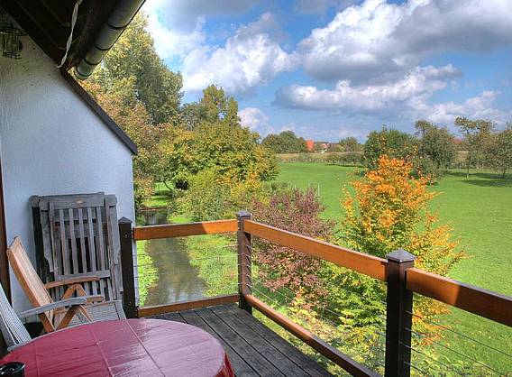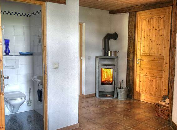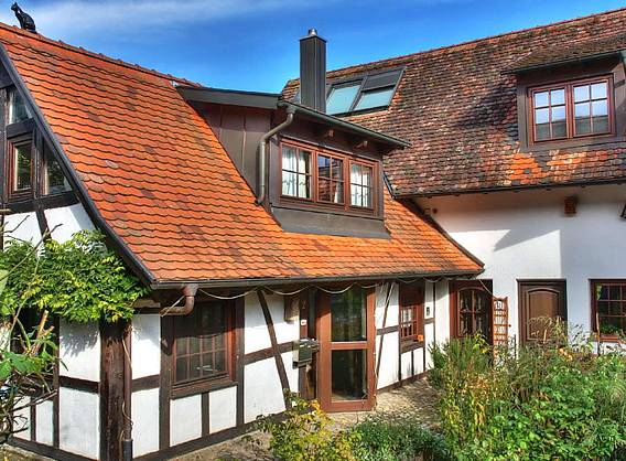 Enormes vigas de roble, el crepitar del fuego en el calentamiento de la chimenea, un gran ventanal con vistas al campo y el Bosque Negro. Póngase cómodo en el frente, usted puede relajarse en una hamaca. Tiempo para relajarse y disfrutar.