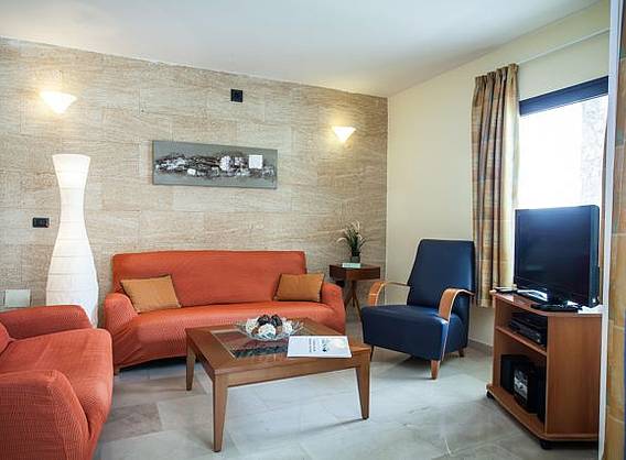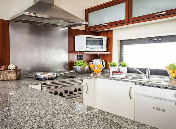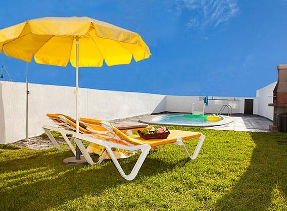 Cada villa consta de: * 3 Habitaciones dobles: 1 con cama de matrimonio de 1.90 x 1.35 m ,balcón y baño con bañera 1 con 2 camas individuales de 0.90 x 1.90 m ,balcón y baño con ducha. 1 altillo buhardilla con cama de matrimonio de 1.35 x 1.90 m y posibilidad de sofa-cama * Cocina totalmente equipada con una amplia variedad de electrodomésticos como vitrocerámica, horno, microondas, frigorífico con congelador, lavavajillas, lavadora, cafetera eléctrica , hervidor de agua y tostadora. * Salón totalmente amueblado con TV Satélite , Radio CD y DVD. * Muebles de jardin y hamacas * Piscina privada. * Caja fuerte gratis. * Cuna para bebé gratis. * Internet (no gratuito) * Parking privado. Nota: Todas las villas son iguales y cuentan con la misma distribución, a excepto de la Villa nº 1 y 5 que la piscina es un poco más pequeña que en las demás.